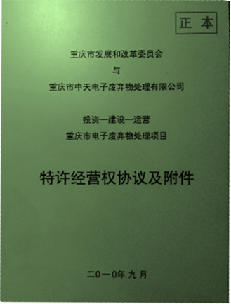 從2010年開始,公司就是重慶市政府公開招投標確定的重慶市電子廢棄物處理特許經(jīng)營權(quán)企業(yè),在重慶市“一小時經(jīng)濟圈”范圍內(nèi)23個區(qū)縣,開展電子廢棄物綜合回收機處理處置業(yè)務(wù)。
